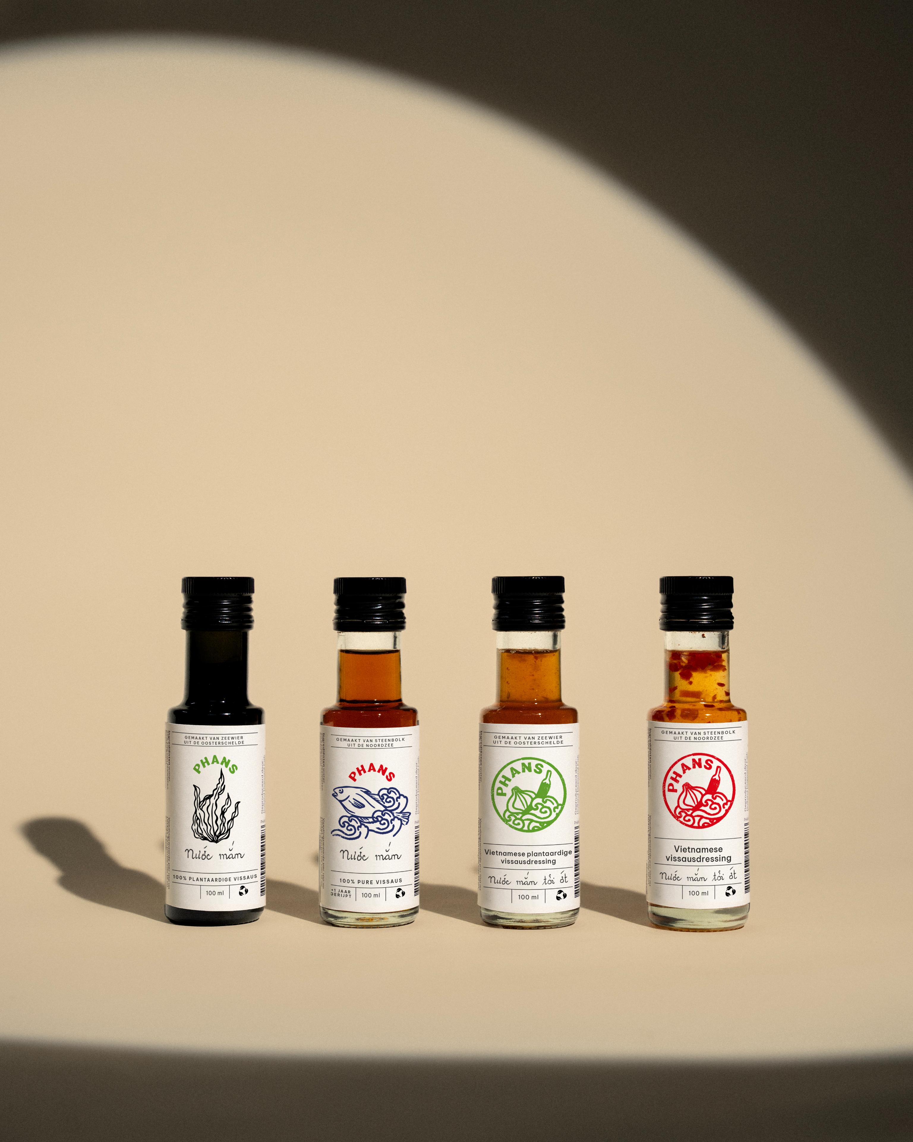 "Phans de lekkerste en duurzaamste vissaus van Europa Phans." Phans is ontstaan uit onze passie voor eten en onze wens om vissaus op de Westerse kaart te zetten. Veel bestaande sauzen bevatten onnodige toevoegingen en missen een rijke, intense smaak. Dit kan beter dachten wij van Phans. We combineren bij Phans een traditioneel familierecept met een blik op duurzaamheid. Door onze vissaus langer te laten rijpen, met vis als bijvangst en een lokaal gekweekte zeewier te gebruiken, is Phans een nieuw en hoogwaardig product in Europa. Phans biedt een assortiment vissauzen en plantaardige alternatieven waarin de smaken van Vietnam en Nederland samenkomen. Het merk staat symbool voor thuiskomen, waar herinneringen en culturen samensmelten tot één product.