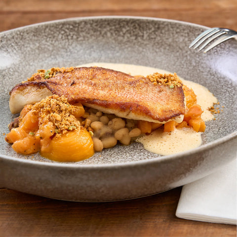 Fish of the day • bean cassoulet • sweet potato • gado gado • boemboe beurre blanc