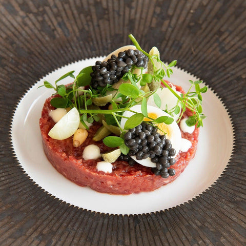 Parkheuvel** - MRIJ beef, tartare, sweet and sour vegetables, quail egg, herring roe caviar (Schmidt classic caviar available as an extra)