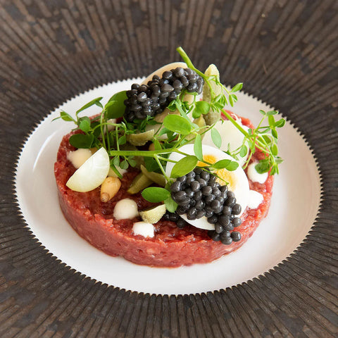 Parkheuvel** - MRIJ beef, tartare, sweet and sour, quail egg, herring roe-caviar. Caviar available to order.
