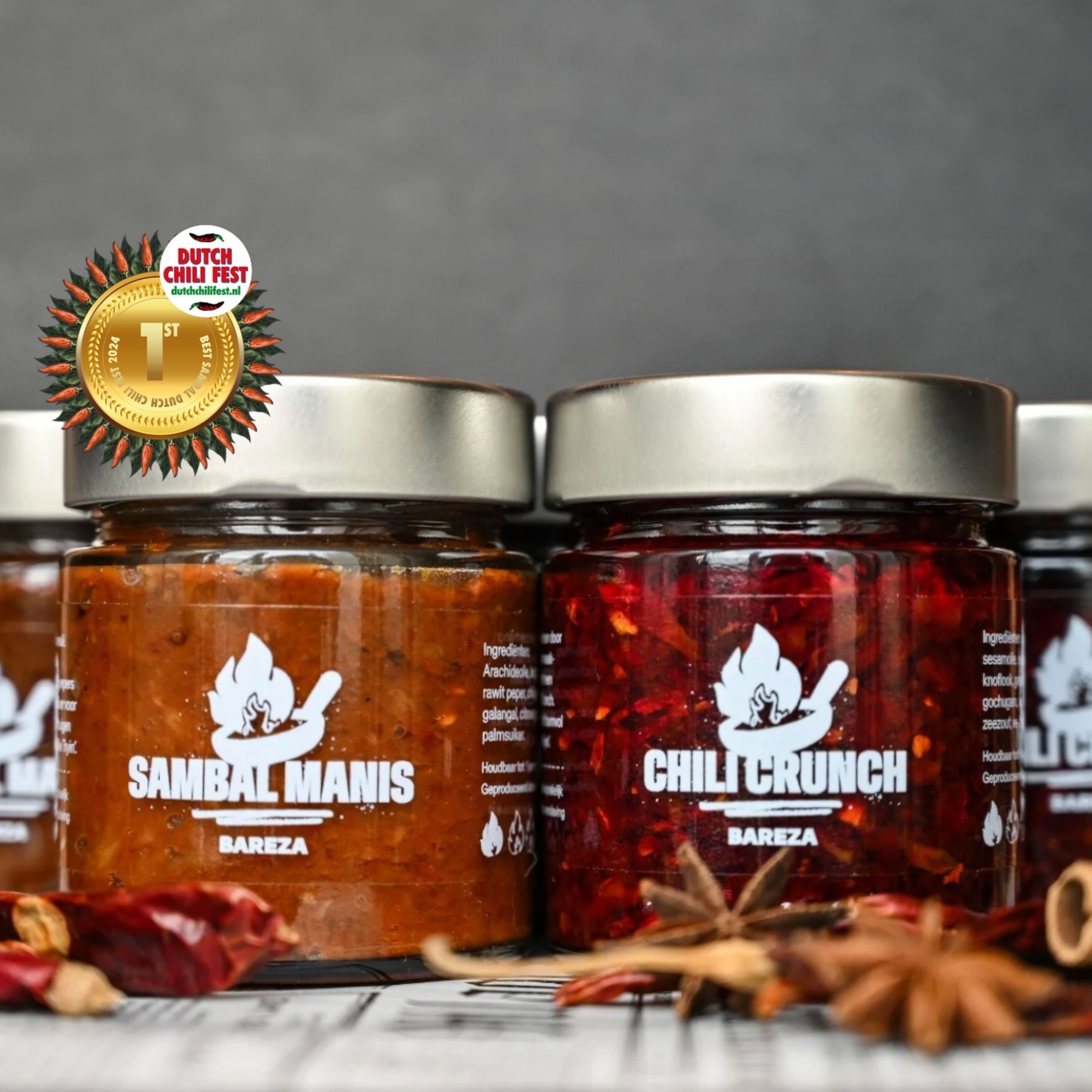 In 2022, Bart and Daniël Reza started organizing food events for friends and family. This was a huge success, so they decided to take it to the next level. In 2024, Bareza was officially founded and they started offering catering in the form of Bareza Buns. They also developed a unique line of seasonings to take every meal to the next level, including Chili Crunch and Sambal Manis. As newcomers to the world of hot sauces, Bareza immediately won the award for Best Sambal in the Netherlands 2024 with their Sambal Manis. This is just the beginning, so keep an eye on Bareza, because more delicious Smaakmakers are coming soon.