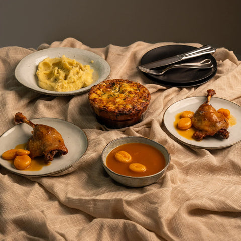 Blissful candied organic duck legs. The candied duck legs are seasoned with garlic, black pepper and coarse sea salt. Then they are cooked for almost 3 hours in their own duck fat. Then we grill the bolts for a crispy sheet. In addition, there is a delicious potato puree with black truffle, a chicory dish with ham and Gruyère Alpage. To complete the duck legs you top it off with the apricot sauce.