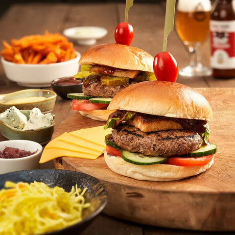 Our organic veal burgers, made from the finest Dutch meat, form the base of your masterpiece. Place them between fluffy brioche buns and add tasty toppings like house-marinated pork belly, red onion marmalade, little gem, tomatoes, and cucumber. Choose your favorite: melting blue cheese or aged cheese.