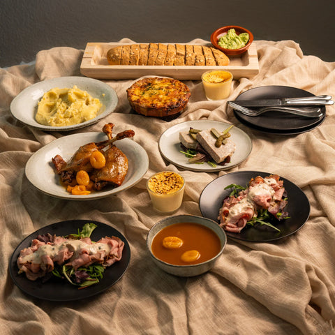 The candied duck legs are seasoned with garlic, black pepper and coarse sea salt. Then they are cooked for almost 3 hours in their own duck fat. Then we grill the bolts for a crispy sheet. This package also contains a delicious mashed potatoes with black truffle, apricot sauce and a chicory dish with ham and Gruyère Alpage. In addition to the main course, we also serve a delicious Vitello Tonnato in advance, a baguette with herb butter and home -made pate with pickles. A blissful crème brûlée for dessert.