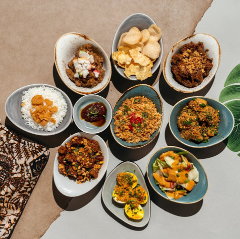 A table full of the most delicious Indonesian dishes put together by chefs Agus Hermawan and Ron Blaauw. The former learned to cook from his mother, while Ron was “trained” by his Indonesian in-laws. The rice table is very extensive but can be served in no time. Preparing the rice table? Really a piece of cake. You can calmly read the instructions, including serving suggestions, here. This Rice Table contains only meat (and vegetarian) dishes and no fish dishes as in the classic Rice Table box.