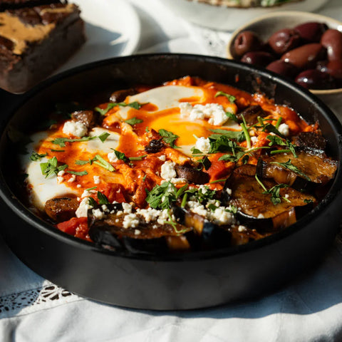 Poached eggs in a spicy tomato sauce with beef merguez and eggplant. Garnished with crumbled feta, pomegranate seeds, and our yogurt dressing.