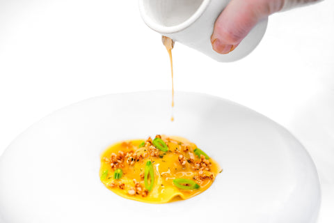 * Ravioli van Twentse bunkerkaas met ossenstaart, crème van rode biet, sugar snaps en gepofte boekweit