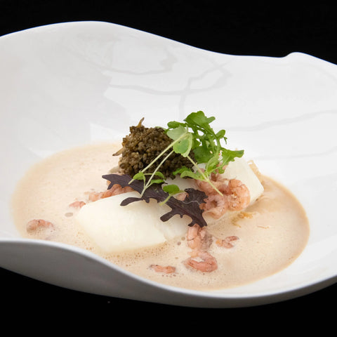 De heilbot, bekend om zijn vochtige textuur en subtiele smaak, gevangen met respect voor duurzaamheid, wordt vergezeld door waddengarnalen, rechtstreeks geleverd uit de rijke wateren van de Waddenzee. De toevoeging van zoetzure bimi introduceert een verfrissende, knapperige dimensie, terwijl de verfijnde schaaldierensaus een diepe, gelaagde smaakervaring toevoegt aan het gerecht.