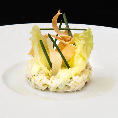 De Noordzeekrab, bekend om zijn verfijnde smaak en sappige textuur, schittert als middelpunt in dit gerecht. Een scherpe wasabi-mayonaise geeft een frisse tegenhanger aan de rijke krab, met knapperige, zoetzure witte radijs voor de nodige balans. Afgemaakt met een krokantje van maanzaad, dat een subtiele nootachtige en lichtzoete smaak toevoegt.
