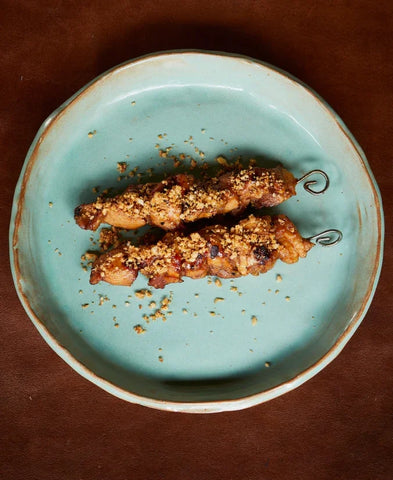 Malse yakitori spiesjes met Asian glaze en hazelnootcrumble. Mooi als toevoeging aan het menu.