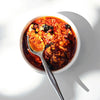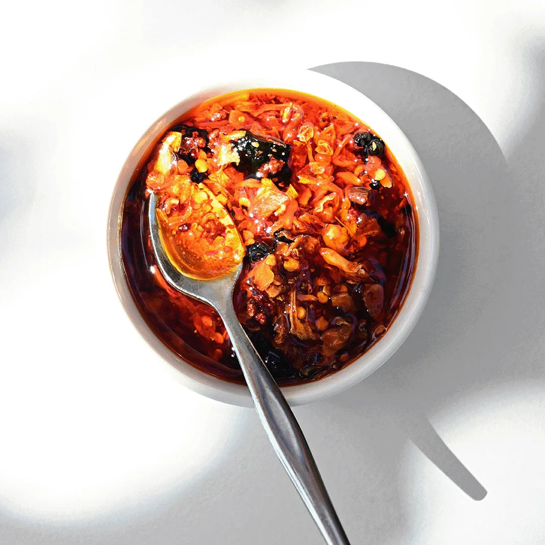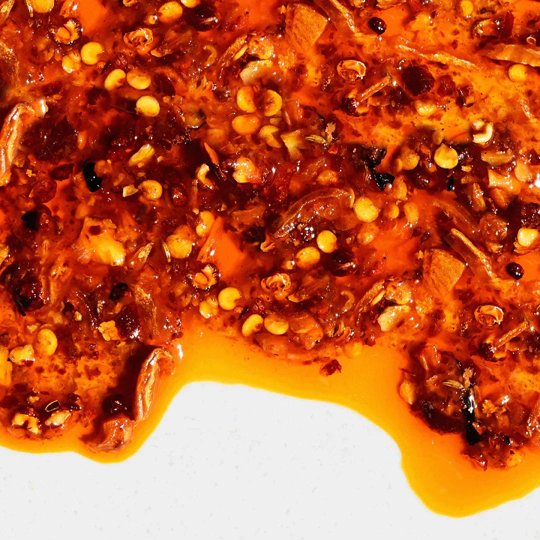 INGREDIËNTEN: SICHUAN CHILLI CRISP Hoog-Oleïne Zonnebloemolie, Sichuan Peperkorrels, Chilivlokken, Knoflook, Ui, Wakame, Shiitake, Witte Peperkorrels, Annatto & Zout.