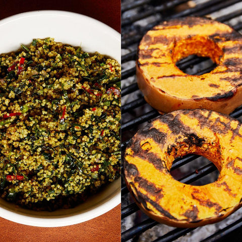 Pompoen met misoboter, furikake met een Groene couscous salade