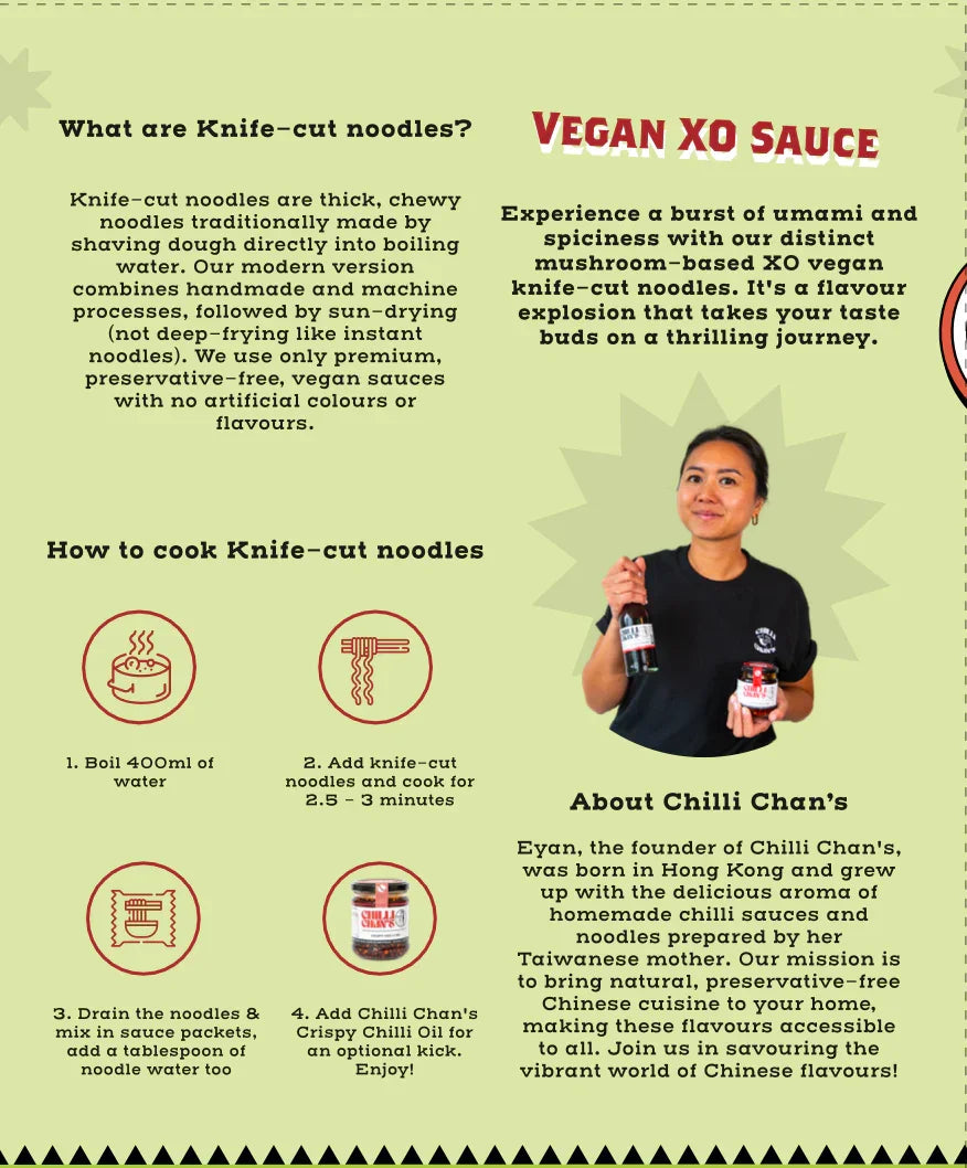 Experience a burst of umami and spiciness with our distinct mushroom-based XO vegan knife-cut noodles. It's a flavour explosion that takes your taste buds on a thrilling journey.