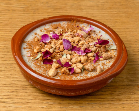 Onze zelfgemaakte rijstpudding met hazelnoot, kaneel en rozenblaadjes. Perfect om het diner mee af te sluiten.