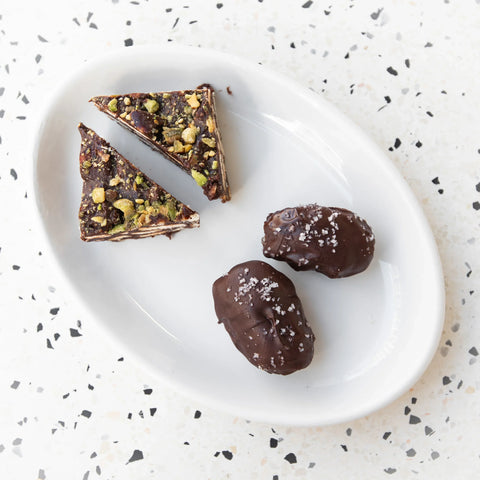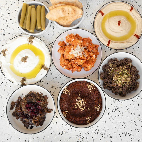 Een set van acht gerechten waarin onze drie vleesspecialiteiten centraal staan. Geniet van kip met citroen en amandelen, lamsvlees met pistachenoten en rozijnen en mals rundvlees met granaatappelmelasse. De selectie wordt aangevuld met frisse dips, pickles en vers Libanees brood.