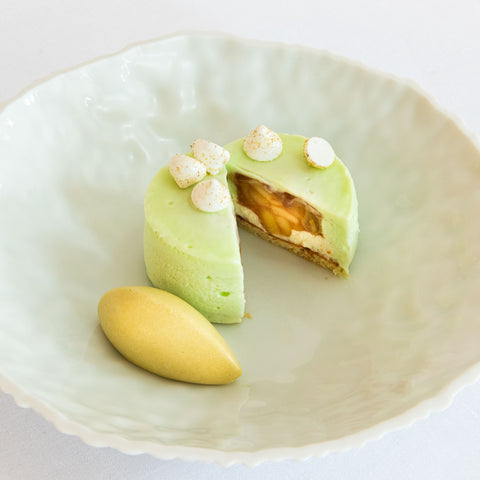 Bij Jef* - Taart van groene appel, witte chocolade en hazelnoot met meringue en zuring parfait