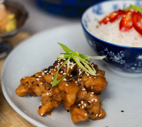- Krokante kippendij, zoetzure sinaasappelsaus, sesam & basmatirijst -